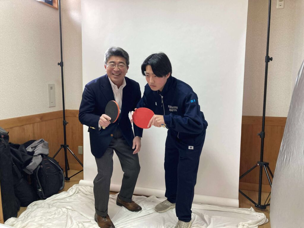 合間に、私と長男の卓球バトルシーンを再現。(撮影は、風間さん)